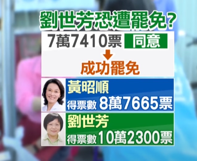 第一个可能的对象刘世芳,会选择的原因,是因为蓝营在高雄左楠区的基本盘稳固,非常容易过1/4门槛,当时她以10万2300票当选高雄立委,击败黄昭顺的8万7665票;若要罢免成功,除了同意票要大于不同意票外,预估需要7万7410票。
