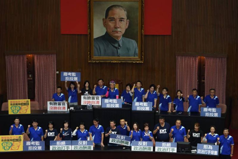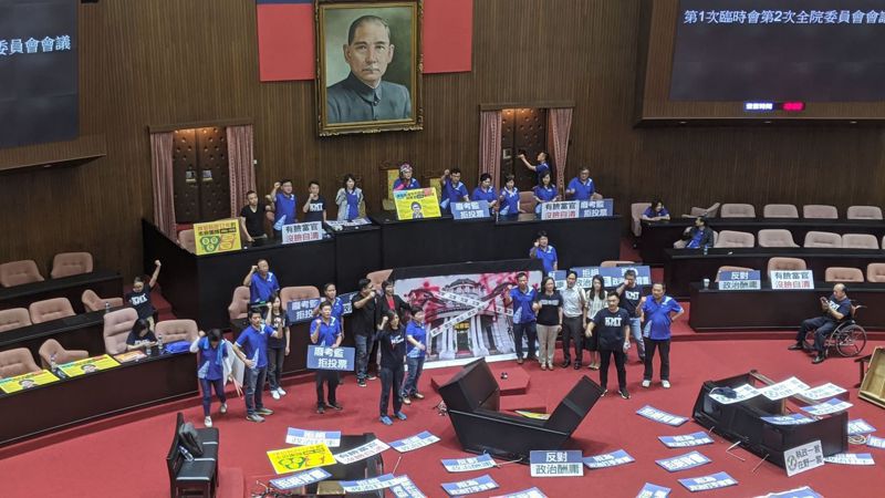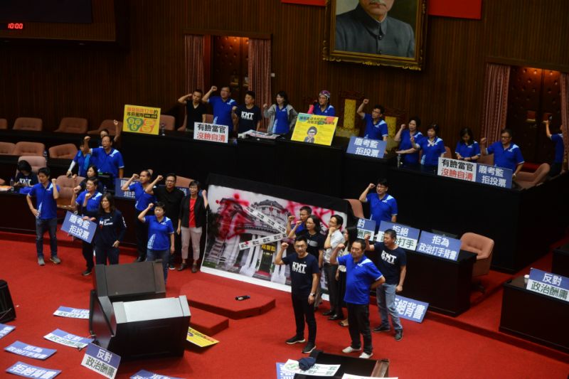 国民党立院党团今天为阻止监察院长被提名人陈菊至立法院备询,在与绿委冲突后占领议场。上午九点半左右,民众党团五位立委也带着“查封监院”海报进场声援,并在议场内高喊“启动修宪、撤除提名”口号。