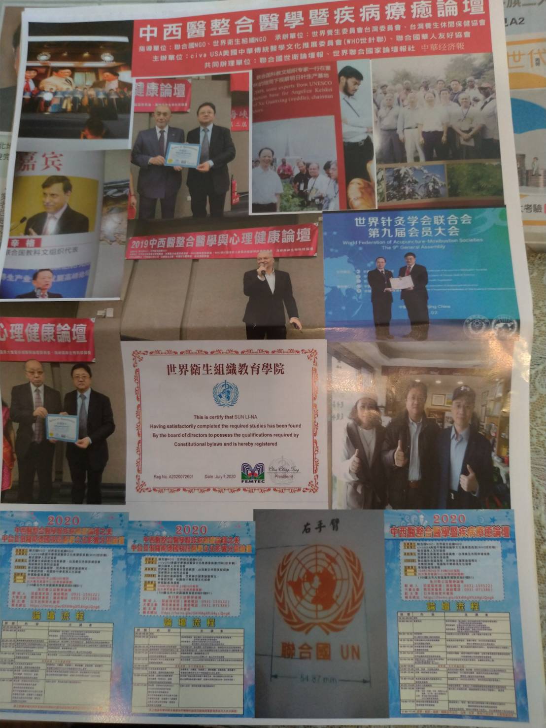 世界养生大会,台北论坛暨国际视讯论坛中西医整合医学与疾病医疗论坛,这次由Civausa 美国中华传统医学文化推广委员会(WHO世针联)、联合国华人友好协会主办,此次论坛邀请单位共同参与论坛的有联合国世卫论坛报、世界联合国家论坛报社、中华经济报,承办单位世界养生委员会及台湾委员会、海峡两岸生物科技协会等。
