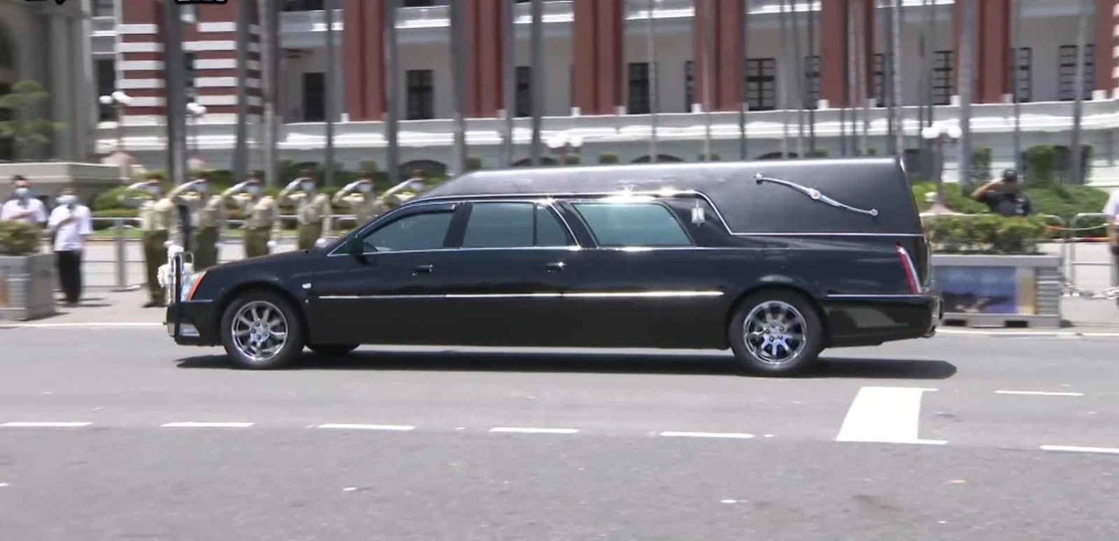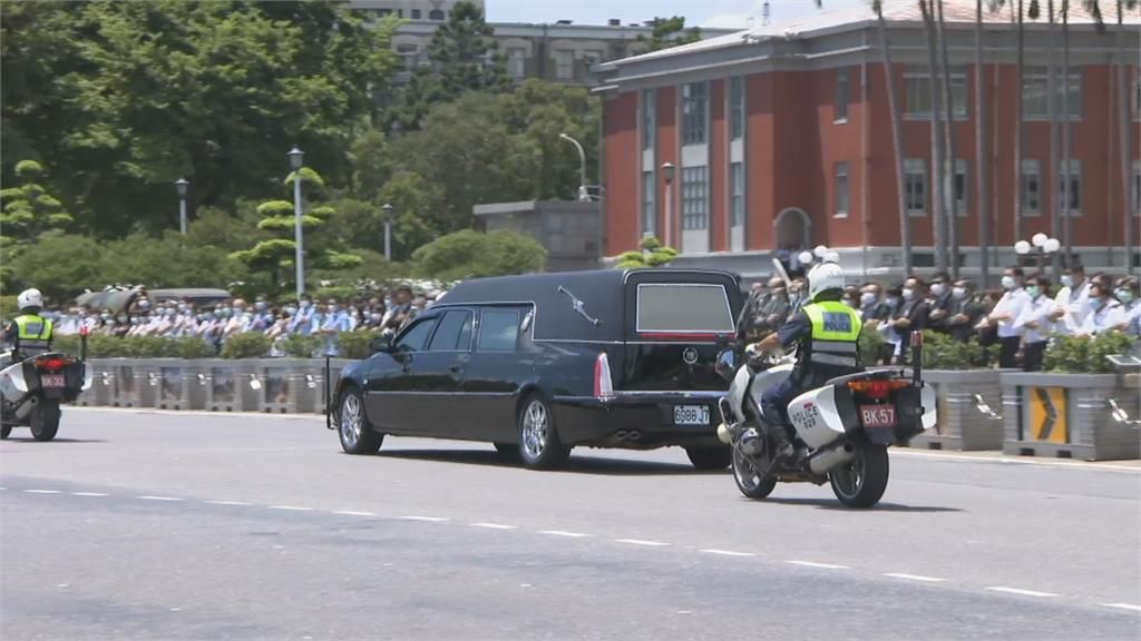 警用重机在最前方开道,前总统李登辉的灵车车队,绕行总统府一圈,象征李前总统的“最后巡礼”。总统府秘书长李大维代表总统蔡英文,率领府内一级主管和宪兵,在府前广场致意送李登辉最后一程,北荣医护列队,7月30日李登辉在台北荣总过世,8月14日清晨从北荣移灵,不少医护人员一早在路旁列队送行。