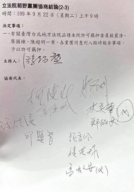 针对北院函文,游锡堃上午9时临时召集朝野协商,各党团均同意将该案列入院会临时报告事项,予以许可羁押,稍早院会已无异议通过决议。