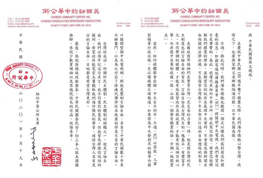 中天新闻台执照年底到期须换照,NCC史无前例先办听证会,引发外界揣测行政部门不当介入。美国纽约中华公所主席于金山特地致总统蔡英文公开信,信中提及海外侨胞对于NCC将关闭中天电视台的消息十分关心,并呼吁蔡政府遵守相关法规,不要伤害台湾自由灯塔的形象。