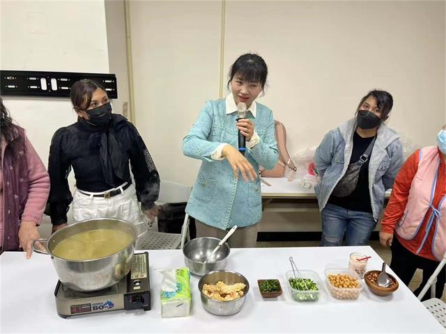 课程最后,张艳君特别带来自己家乡特色饮食“桂林打油茶”与大家分享。张艳君提到,“打油茶”是广西桂北地区及少数民族一种特别的饮茶方式,被列为非物质文化遗产,也是桂北人一日三餐离不开的美食。油茶的制作需准备三样专门的制作工具,包括茶锅、茶槌、茶隔,将茶锅烧热后放入少量的茶油,再将洗干净的茶叶和生姜片倒入锅中,用茶槌反复捶打和按压,使茶叶里汁液完全渗出,之后再加入热开水煮至沸腾,用茶隔滤掉茶渣后就是道地的油茶了。现场学员都是第一次体验油茶制作及品尝油茶,大家都觉得相当新奇有趣。