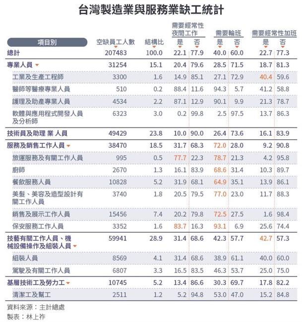 製造業方面,「技藝有關工作人員、機械設備操作及組裝人員」共有近6萬職缺,其中有4成比率,必須配合公司輪班與經常性加班。「基層技術工及勞力工」職缺約1萬人左右,其中3成需配合公司輪班,就連2511個「清潔工及幫工」職缺,都有53%職缺,必須配合輪班。
