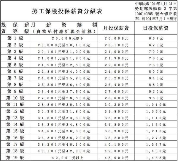 2. 勞工保險投保薪資分級表、勞工退休金月提繳工資分級表配合調整,修正後共分為17級,第一級投保薪資改為22,000元,刪除原分級表第二級2,1900元,第三級則遞移為第二級,依此類推;22,800元等級以上將維持原級距及金額,最高級仍維持45,800元,