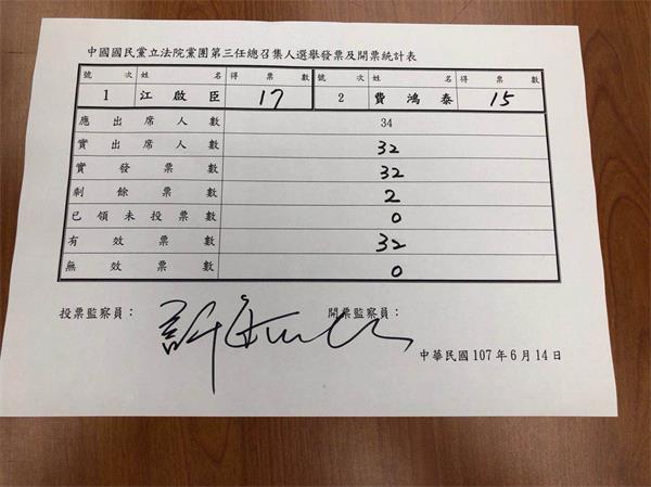 由於前立法院長王金平、藍委羅明才未出席投票,有效票共32票。開票結果,江啟臣獲得17票、費鴻泰獲得15票,江當選下屆總召。江受訪表示,這次總召選舉與前兩次一樣平順圓滿,也沒有誰贏誰輸之分,只是決定由誰服務黨團,更是黨與黨團的勝利。