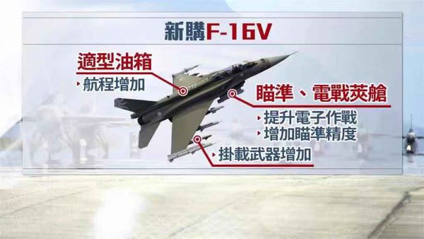 台湾今年汉光演习,从既有战机升级的F16V首次亮相,但航太展的模型看来,添购的新机外型有不小改变,背后多了适型油箱,让机翼挂架可以加挂武器;机腹也配挂了升级版作战荚舱,航程和战力都大幅增加。