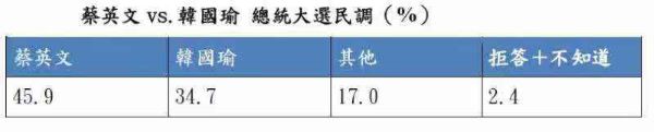 《天下杂志》10日公布的2020总统大选民调显示,若为蓝绿对决,蔡英文支持度为45.9%,韩国瑜则为34.7%。 (天下杂志提供)