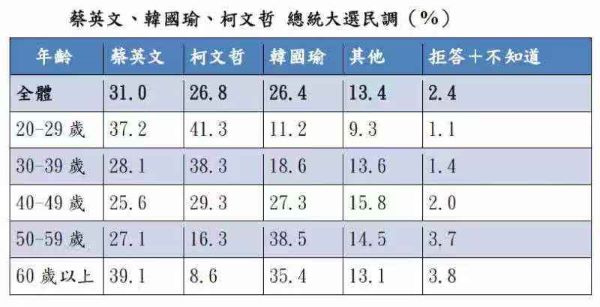 而如果台北市长柯文哲参选,和蔡英文、韩国瑜对战,蔡会以31%支持度赢过柯的26.8%与韩的26.4%,但透过数据来看,49岁以下的支持度是柯文哲领先,吸纳瓜分蔡英文的支持者。对此,《天下》指出,蔡英文虽前景看好但仍有隐忧,因为其不满意度高于满意度,且非常不满意有28.2%,高于不太满意的24.5%,显示讨厌她的人已经根深蒂固。