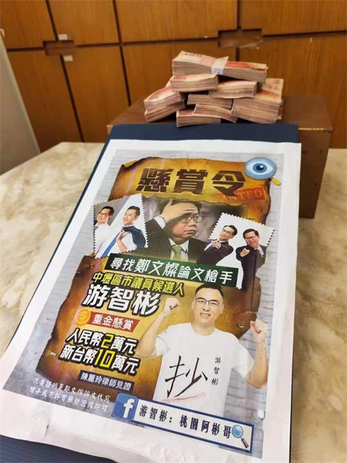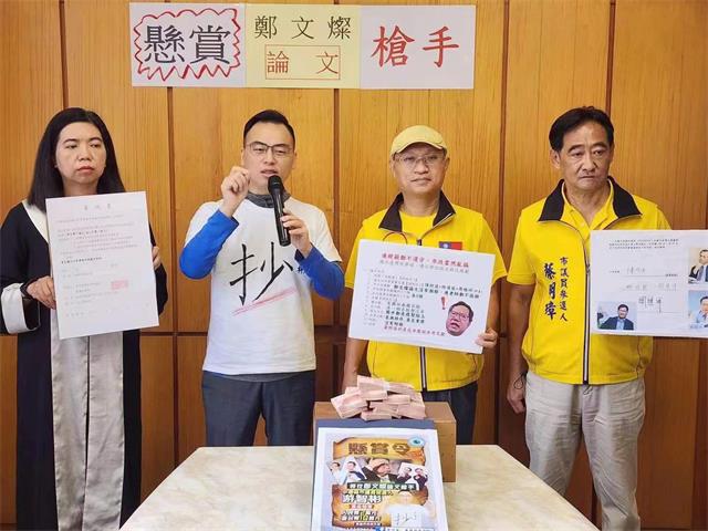 新党发言人陈丽玲律师、桃园市中坜区议员候选人游智彬等人今(11)日召开「悬赏10万寻找郑文灿论文枪手 共犯林佳龙踹共」记者会,公布悬赏10万新台币现金寻找郑文灿论文代写枪手,呼吁若是中国大陆枪手自首也可以获得人民币2万元。游智彬质疑,郑文灿论文极可能是大陆枪手代写,否则,郑文灿本人过了一周后仍一反常态低调避谈,毫无回应?