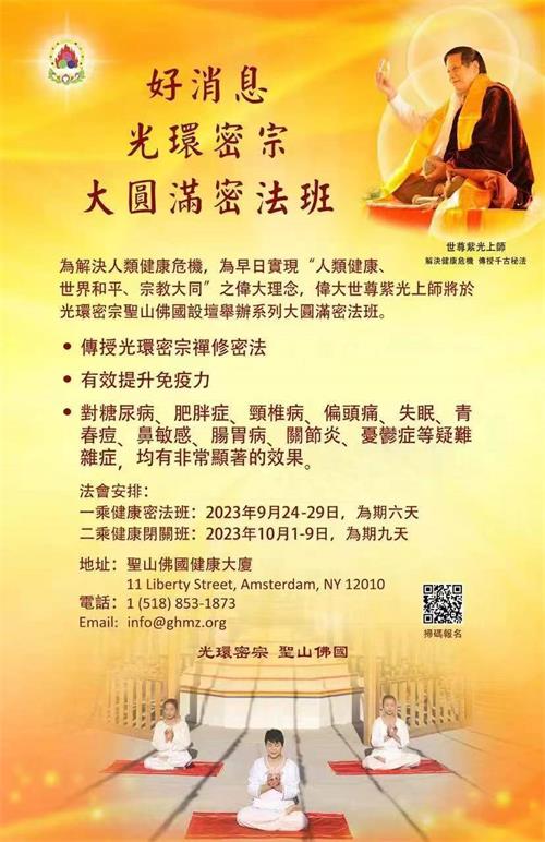 应广大信众的强烈要求,早日实现“人类健康、世界和平、宗教大同”的伟大理念,紫光上师逐步开放光环密宗大圆满高层次的千古密法,将于2023年9月24-29日,在纽约州府圣山佛国举办为期六天的光环密宗大圆满一乘密法班,改善学员健康水平,有效提升免疫力。