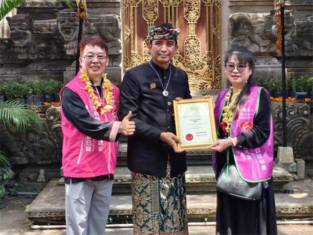 台湾“全球商联会全球总会”印尼皇宫国际公益慈善之旅一行23名百工百业代表今(18)日上午由总督导易淑宽带领在当地警方护送下前往峇厘岛皇宫,国王Cok Ibah与王室妻子Jero Asri Kerthyasa亲自接见并致赠奖牌。代表“台湾之光”获此尊贵殊荣,易淑宽也当场将2024年AI医疗照护系统结合纺织品的AI黑科技衣敬赠给国王伉俪表示感谢。