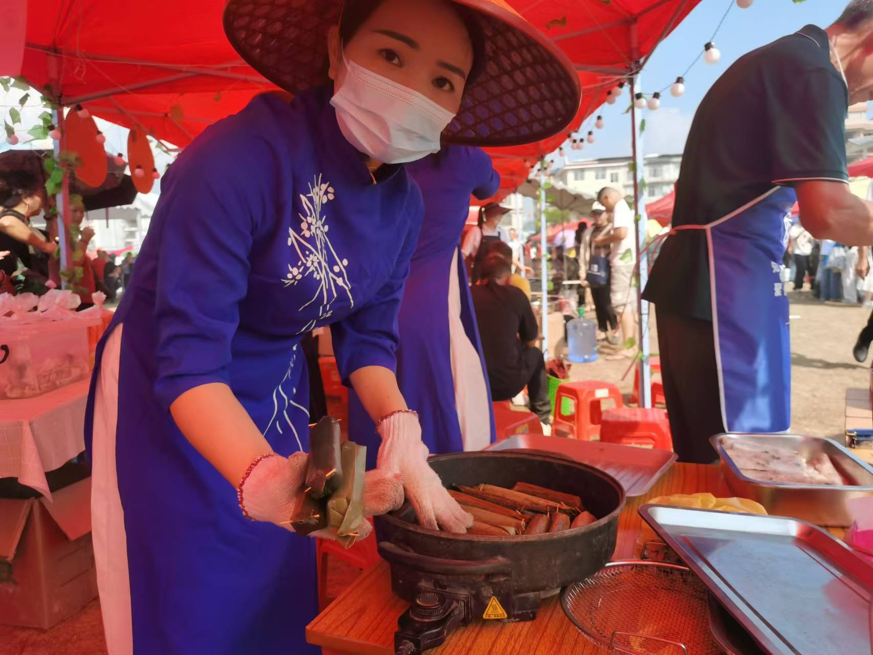 今年64岁的阮仕富,1978年被越南赶回国后直接安置到柳城华侨农场,也把做美食的手艺带到了柳城华侨农场,为了这三天的美食节,全家总动员,提早作了准备,卷、炸、煎和摆摊各个岗位各司其职,记者把他家的越南春卷、印尼糯米条、印尼九层糕等美食尝了个遍,味道还真不错。