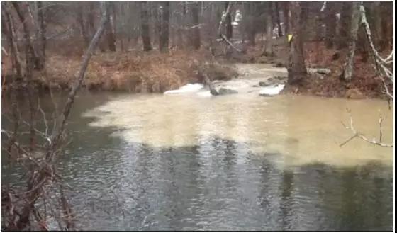 (被“龙泉寺佛学公司”排放的废水污染的河流。图源:法国国际广播电台)