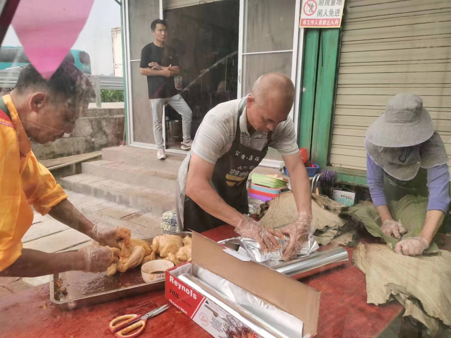 在窑香基地,村民们把50多只淹好的鸡,用荷叶包裹后,再用锡纸包裹……