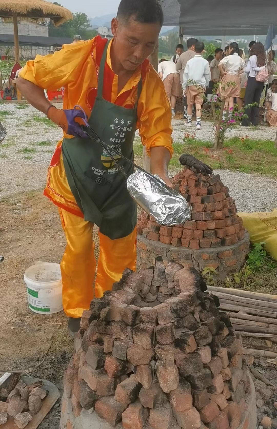 另一边17个窑,正被村民用柴火烧得发烫。看着村民熟练地将鸡、红薯放进窑里他们也将自己带来的玉米、鸡翅等,让村民顺带放进窑里烘焙。