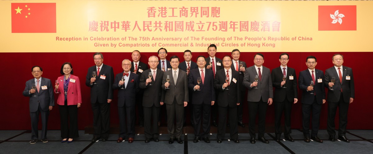 华通社香港电 香港工商界同胞庆祝国庆筹委会今天(25日)在港岛香格里拉大酒店举行「庆祝中华人民共和国成立75周年国庆酒会」。香港特别行政区行政长官李家超、中央政府驻港联络办副主任尹宗华、外交部驻港特派员公署副特派员李永胜、政务司司长陈国基及立法会主席梁君彦担任主礼嘉宾,联同筹备委员会主席团成员、工商及社会各界友好逾500位嘉宾共贺国庆。