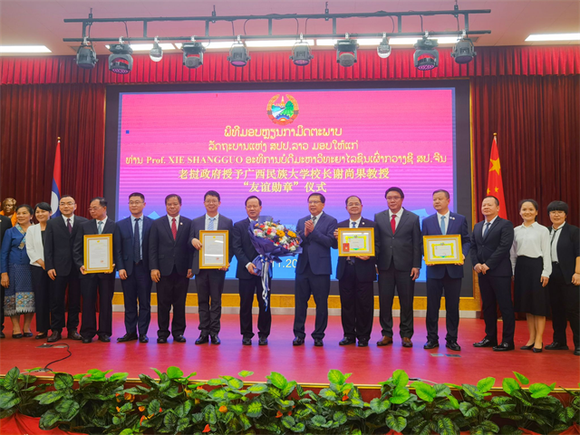 老挝人民政府授予广西民族大学和校长谢尚果本人友谊勋章,既是对广西民族大学几十年来深耕中老友谊,在人才培养、文化交流等方面所作出的贡献给予高度评价,也是对谢尚果校长本人促进中老友好交流所作出的努力给予充分肯定,充分彰显了广西民族大学国际性的办学特色,也充分体现了广西民族大学在助力构建中国—东盟命运共同体,共建“一带一路”的特殊地位。(校对:黎潘东)