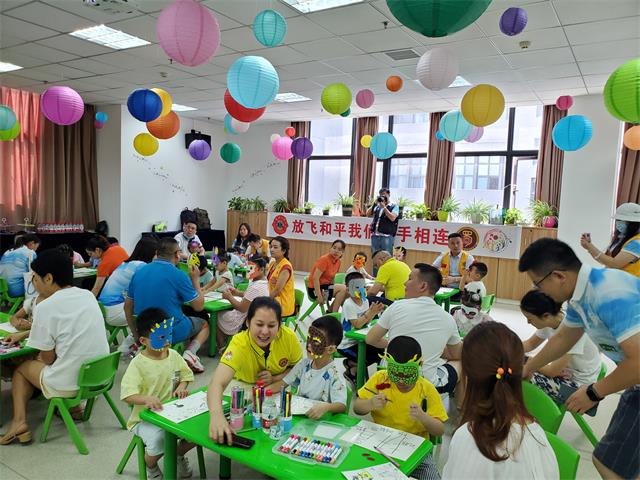 9月14日五支服务队的狮友们在乐语鸟特殊儿童早期干预中心陪伴30名有听力障碍和语言学习障碍的特殊儿童在画纸上共同描绘孩子们心中的和平,并一起放飞象征和平的纸飞机,那一刻所有人的脸上都充满了喜悦的神情,“我们心手相连”被淋漓尽致地体现了出来。