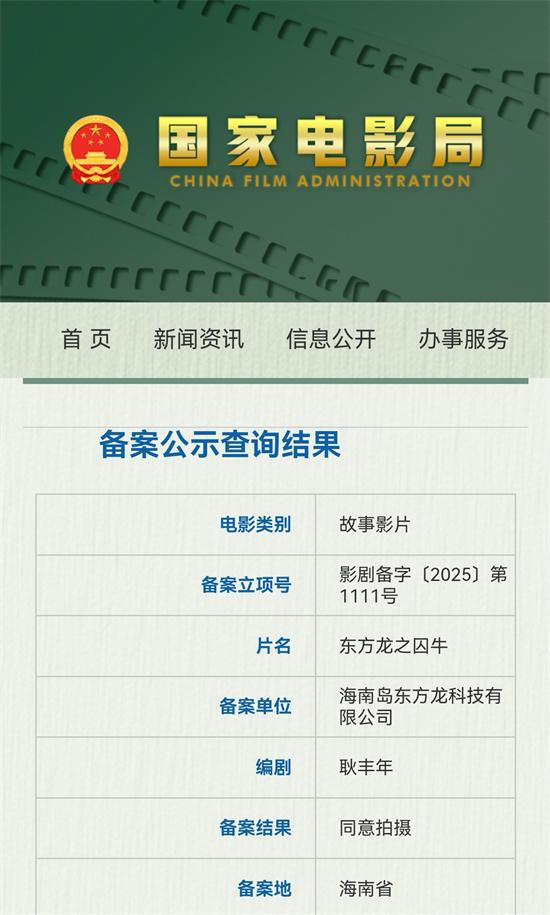 海南岛东方龙科技有限公司申报,首部5D科幻电影《东方龙之囚牛》由国家电影局批准备案通过,影剧立项号(2025)第1111号,影片拟投资30亿元,票房回报可达100亿元以上,由妙手丹武(北京)文化传媒有限公司发起,共打造9部系列作品,均釆用5D、动漫、数字等新兴拍摄技术,拟邀电影《阿凡达》美国卡梅隆特效导演和特效团队,同时采用中国鸿蒙数字技术,打造国家级文化交流和国际 IP 版权数字文化资产交易的生态体系,走出一条中国电影新思路为国家、为党和人民做出新的贡献!