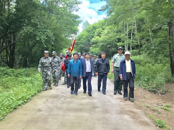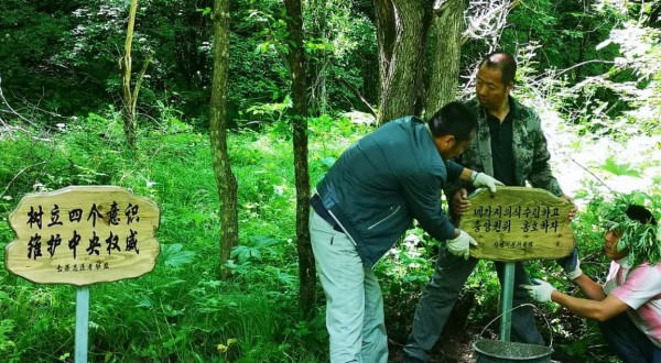 凤凰新闻社社长、总编田长友先生(右一),同汪清县党校领导(中)、龙井县党校领导(左一)在东满抗日游击根据地交谈