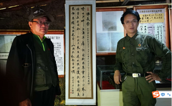 田长友和张铁先生在创作、书写的“七律”《悼长荣》条幅前留念
