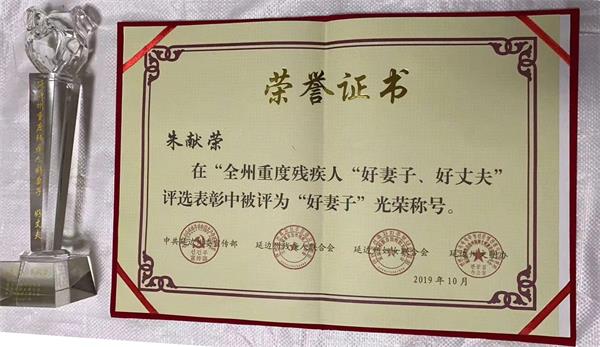 朱献荣用爱编织了一段美好的爱情故事,感动了无数的天林人,她先后被评为首届延边好人、道德模范、天林好人。2019年在全州重度残疾人“好妻子、好丈夫”评选表彰中被评为“好妻子”光荣称号。