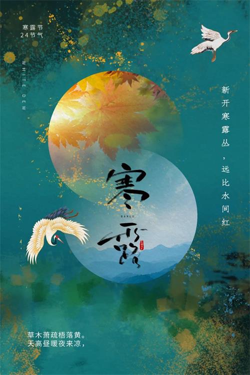 一候鸿雁来宾。寒露之日,“鸿雁来宾”。鸿雁白露节气已经开始南飞了,此时是最后一批,古人称后至者为"宾"。 二候雀入大水为蛤。后五日“雀入大水为蛤”,鸟雀入大海化为蛤蜊,飞物化为潜物,古人对感知寒风严肃的一种说法。 — 菊月 — — 阳精 — 红梅傲雪,是春寒料峭中啼晓之早霓;金菊凌霜,乃秋残月冷里别暮之晚霞;花期至此便绝。 这两种花因此香最清,而两花相较,金为衣兮菊为裳,菊更孤傲之因是,“有者非自己所有”。 为何?其“圆花高悬向天极,纯黄不杂向土色”,仰首沐天露,又染正黄之纯色,故名"阳精",又名"阴成"。 —人淡如菊 — “落花无言,人淡如菊”是司空图《二十四诗品》中论“典雅”的用词。喜欢陶渊明诗,就“采菊东篱下,悠然见南山。山气日夕佳,飞鸟相与还”。 — 秋钓边 — — 观红叶 — 寒露时节,赏红叶早已成为市民的传统习惯与秋季出游的重头戏。 秋风飒飒,黄护叶红。寒露过后的连续降温催红了满城的枫叶。金秋满山层林尽染,漫山红叶如霞似锦。 — 吃芝麻 — 《月夜梧桐叶上见寒露》 唐•戴察 萧疏桐叶上,月白露初团。 滴沥清光满,荧煌素彩寒。 风摇愁玉坠,枝动惜珠干。 气冷疑秋晚,声微觉夜阑。 凝空流欲遍,润物净宜看。 莫厌窥临倦,将晞聚更难。 ✎ 寒露时节的一个月明之夜,梧桐树叶上的露水引起了诗人浓烈的兴趣。通过一滴寒露,诗人描绘出了一幅深秋时节令人神往的美妙画卷。 《池上》 唐•白居易 袅袅凉风动,凄凄寒露零。 兰衰花始白,荷破叶犹青。 独立栖沙鹤,双飞照水萤。 若为寥落境,仍值酒初醒。 ✎ 凉风习习,晨露清冷,兰花凋零,荷叶虽残破依然带绿,一只鹤独自栖息在沙滩上,萤火虫双双飞舞在水面上。作者自认为寥落无奈,还是酒醉初醒的意境中所见眼前景象。 《八月十九日试院梦冲卿》 宋•王安石 空庭得秋长漫漫,寒露入暮愁衣单。 喧喧人语已成市,白日未到扶桑间。 永怀所好却成梦,玉色彷佛开心颜。 逆知後应不复隔,谈笑明月相与闲。 ✎ 在秋风瑟瑟的空楼中,衣着单薄的妙龄少妇幻想着如意郎君能来陪伴她共度欢颜。 嘉定巳巳立秋得膈上疾近寒露乃小愈》 宋•陆游 小诗闲淡如秋水, 病后殊胜未病时。 自剪矮牋誊断稿, 不嫌墨浅字倾欹。 《蝶恋花·早行》 宋•周邦彦 月皎惊乌栖不定。 更漏将残,辘轳牵金井。 唤起两眸清炯炯,泪花落枕红绵冷。 执手霜风吹鬓影。 去意徊徨,别语愁难听。 楼上阑干横斗柄,露寒人远鸡相应。 ✎ 此纪别之词。从将晓景物说起,而唤睡醒,而倚枕泣别,而临风执手,而临别依依,而行人远去,次第写出,情文相生。结句七字神韵无穷,吟讽不厌。
