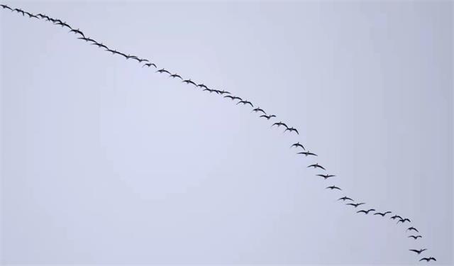 3月18日早6点左右,天桥岭上空接连飞过一群群的大雁,这些大雁在空中队形整齐、造型各异,有大队、有中队、有小队,雁群们在迁徙的季节,常集成数十、数百甚至上千只得大群,并由一只有经验的头雁领队飞行,它们时而排成“人”字,时而排成“众”字,时而排成“一”字向北飞去,场面十分壮观,展现出一幅幅大美的生态画卷,一时之间,吸引不少群众驻足观看。