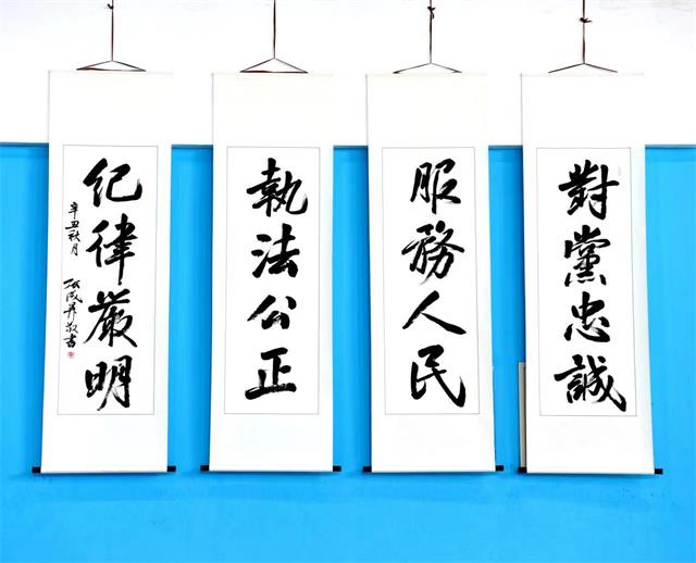 走进黑龙江出入境边防检查总站轮训大队警体馆展览现场,“对党忠诚、服务人民、执法公正、纪律严明”4幅卷轴书法作品映入眼帘、格外醒目、催人奋进。中国书法家协会会员、黑龙江出入境边防检查总站副总站长张成生表示,作为一名书法爱好者,业余时间用毛笔手抄训词,深刻感到习近平总书记重要训词字字千钧、句句入心,备受鼓舞、令人振奋。培训学员在参观展览时纷纷表示,训词所指,公安所向;旗帜引领,续写荣光。今后坚决把深入学习贯彻习近平总书记重要训词精神,作为一项育警铸魂、固本培元的长期战略工程,以实际行动践行重要训词精神,忠诚履行职责使命,喜迎二十大,护航新征程,建功新时代。