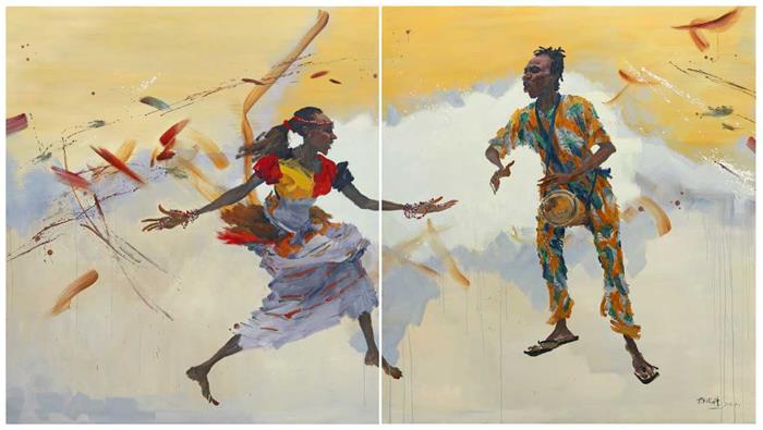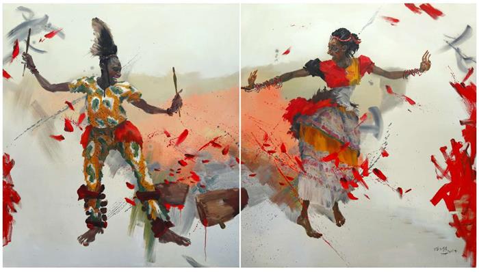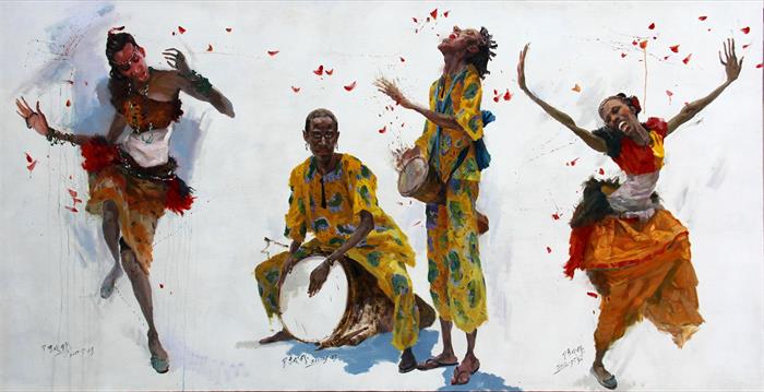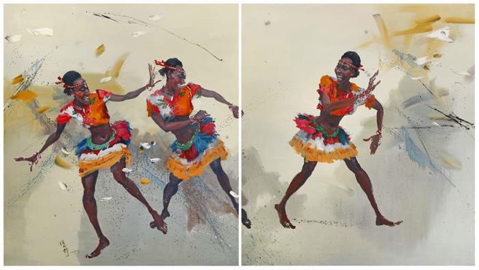那些颇具性情的笔触,时而如猿群腾挪高跃,时而如风拂树梢一掠而过,惬意轻松, 画笔是那样极具把握地挥洒出画家对非洲文化的理解与欣赏,它们带著画家和画中人同歌共舞,其形通过意交融的意境。正如南田所说:曲终人不见,化作彩云飞。中国人民大学徐悲鸿艺术研究院院长徐庆平也说:“我们能从他的画中感受到学院系统严谨的教育对他形成自己画风的影响和帮助,同时也能从中品出他对艺术门类触类旁通的掌控能力和进行艺术创作时奔流的激情与想象。”
