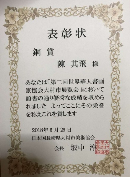 2018年6月29日,为期5天的“纪念中日友好40周年暨第二届世界华人书画家协会名家作品展”在日本长崎县大村市举行闭幕式。这次展览由世界华人书画家协会日本分会主办,来自江苏省盐城市滨海县的农民画家陈其飞的作品《雪竹》,荣获了嘉奖——铜奖。