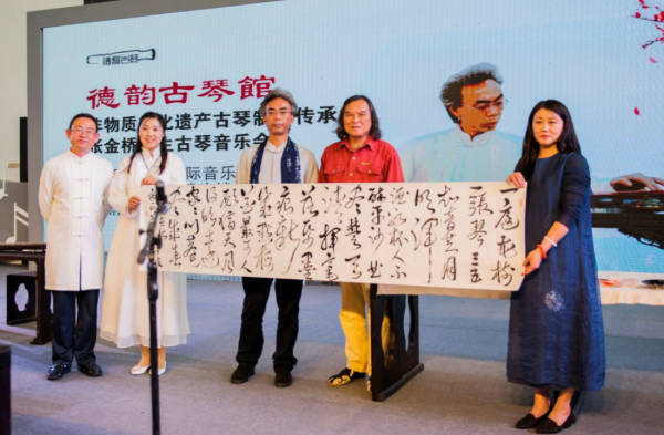 古琴距今已有三千多年历史,被国人推崇为"君子乐器",与棋、书、画同根一脉,自古就是文人雅士生活、艺术交流的形式。音乐会由古琴艺术家张金桥先生演奏的《良宵吟》开始,≪游子吟≫ 《平沙落雁》《卧龙吟》《潇湘水云》《广陵散》等曲,原计划一个小时的演出,持续了一个半小时。张金桥先生演奏的琴曲,时而悠扬婉转,空灵柔美,直击人心,时而如大江奔流,成大气磅礴之势,自由奔放的情感一泻千里,刚柔相济,琴人合一的意境,感染着每一位观众。几位书画艺术家的情愫也沉寝在古琴的意境里,激发了创作灵感,琴书相合,笔式跌宕遒力,直抒胸意,两种同根同源古文化的交相呼应,产生心灵的共鸣,是隔着时空与古人的对话。这种别开生面的“文化盛宴”,深深吸引了在场观众的视觉与听觉,让人耳目一新。使观众充分领略到传统文化的魅力,增强了对传统文化的热爱和民族的自豪感,久久驻足,意犹未尽,不愿离去。