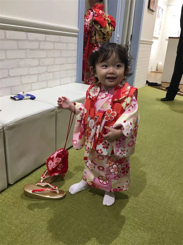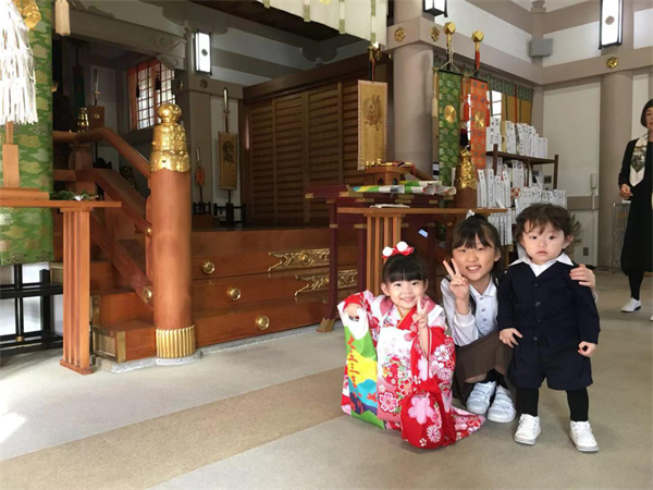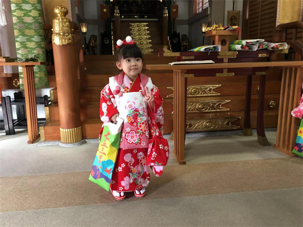 七五三は子供の成長を祝い、子供自身にもその自覚を与えるためのものです。日本の風俗習慣の一つです。11月13日に神社に参り、晴れ姿を記念に残しました。
