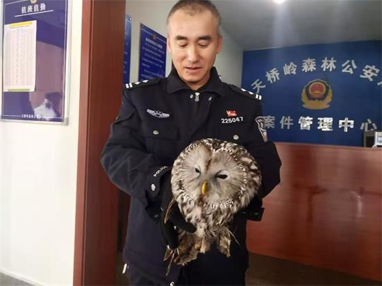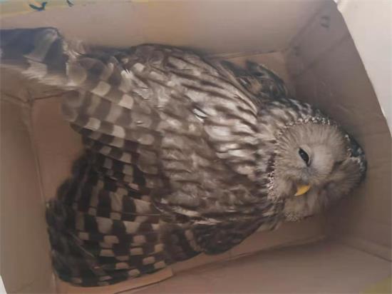 11月26日上午,天桥岭居民在天山村到天桥岭林业局途中,发现一只受伤的大鸟,立即送到天桥岭森林公安局青松派出所。森侦大队与天桥岭东北虎保护区管理局工作人员及时赶到现场,经检查鉴定,这只受伤的大鸟为国家二级重点保护野生动物长尾林鸮,左翼翅膀受伤,已不能飞行,如果不能得到及时救治极有可能有生命危险。因救助条件受限,需要专业医疗救治。天桥岭森林公安局立即派人将受伤的长尾林鸮送到延边野生动物收容救护中心进行专业救治。