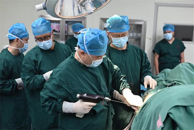手术演示阶段。张英泽院士先后为井陉两位股骨粗隆间骨折患者成功完成手术治疗。为了给患者制定最佳的手术方案,张英泽院士团队与井陉县医院李计东书记、李博副书记带领的骨科团队详细的讨论,最终决定采用最新的PFBN新型股骨近端双三角仿生髓内钉进行治疗。