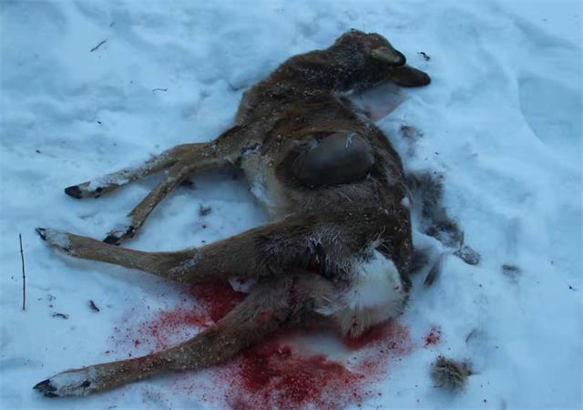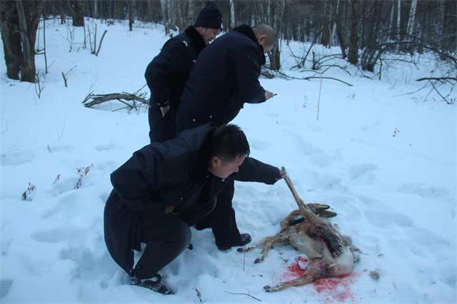 1月7日,天桥岭森林公安分局张家店派出所民警和天桥岭林业局张家店林场巡护员一起冒着零下20多度的严寒,踏雪入山巡护,当行至到该场南沟38林班时,突然发现前方不远处雪地里,一只狍子躺在地方一动不动。走进观察没有发现狍子身上有猎套、刀伤和枪伤,排除人为致死,在现场发现狍子的腿部和内脏存在撕咬痕迹,附近地上有血迹和猫科动物足迹,当时狍子的尸体还没冻僵,说明野生动物猎杀狍子后离开不久。