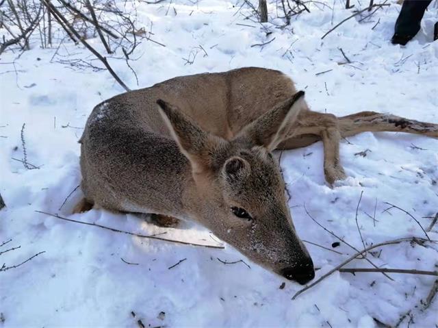 1月12日,一只被陈年老套困住的野生狍子,非常幸运的遇到清山清套至此的,吉林省天桥岭林业局动保和新华林场及吉林天桥岭森林公安分局新华派出所民警,在寒冬的雪地上捡回一条“狍”命。