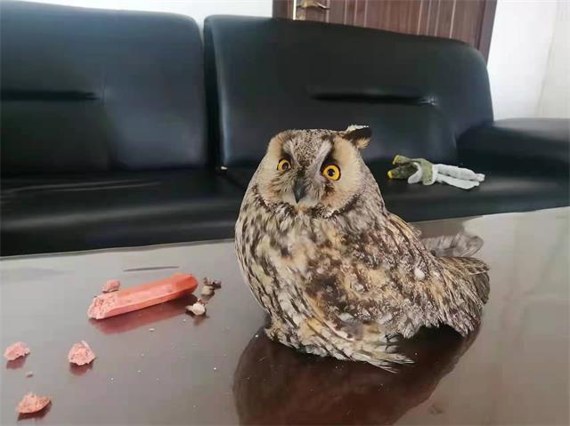 当日,从事道路养护工作的董某,在上班途中发现一只猫头鹰趴在路边一动不动,董某上前查看后发现猫头鹰羽毛上有血迹,一只翅膀已折断情况。随后董某将其抱起放到养护车上,并联系朋友关某询问如何救助猫头鹰,二人一起将受伤猫头鹰送到天桥岭森林公安分局。民警在接受受伤猫头鹰后,及时与天桥岭林业局动保工作人员取得联系,经工作人员鉴定,受伤的猫头鹰属于国家二级保护动物,别名鸮或枭,其面貌像猫,因此得名猫头鹰。这只大眼萌猫头鹰来到派出所后,耳朵竖得像天线吗,瞪着铜铃般的大眼睛,眼神里充满了惊恐和好奇。为帮助猫头鹰尽快恢复体力,民警买来火腿肠掰碎喂其进食,可猫头鹰却用灵活的舌头将民警喂进嘴里的火腿肠弹出,瞪着灵动的大眼睛看着民警拒绝食用。民警又到食堂找来一些鲜鱿鱼,洗净切碎尝试着再次喂食,没想到猫头鹰居然开心的吃起来,这情况让民警一阵无语,原来这“哥们”是挑食啊!喜欢没有污染的食物。24日早,猫头鹰体力恢复,动保处工作人员将猫头鹰送到延边野生动物收容救护中心进行专业救治。