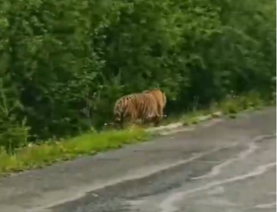 老虎一步三回头地沿公路行走