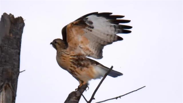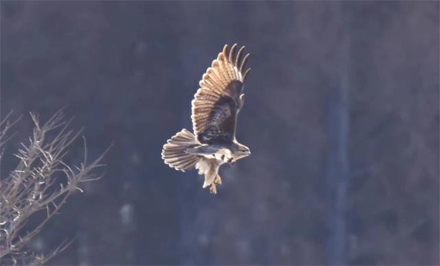 12月13日,吉林省公安厅森林公安局天桥岭森林公安分局民警在巡护途中发现了一只大鸟,一会在树上扭头舒展它的后尾羽毛,道路上车来车往的车流声,似乎丝毫不影响它对自己的尾羽梳理,从褐色的背羽下尾部露出的乳白色羽毛略显蓬松。眨眼间,又展开双翼翱翔天空。民警随即把这一精彩画面用相机记录下来,发给了天桥岭林业局动保部门,经鉴定,这只鸟叫普通鵟。但它一点都不普通,是国家二级保护动物,堪称翱翔天空中的“战斗机”。