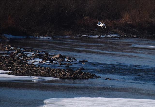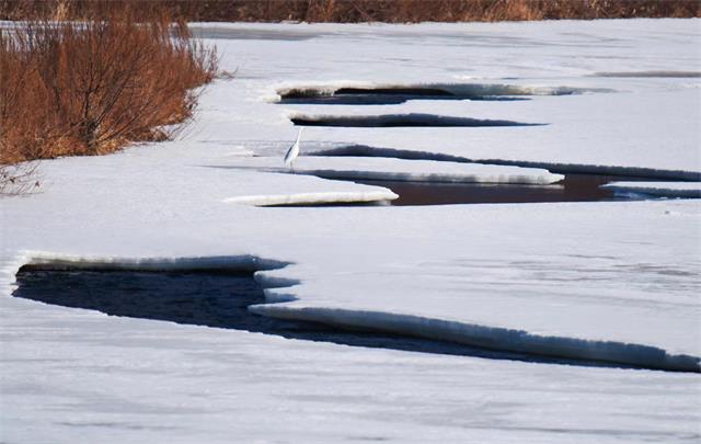 中白鹭静静的站立在初融的冰面上,似等待、似寻觅,洁白的身躯仿若与冰面融为一体,被夕阳拉长的身影仿佛诉说着无限的惆怅。“那雪白的羽毛,勾勒出流线型结构,那橘黄色的长喙,青色的脚,增之一分则嫌长,减之一分则嫌短,素之一分则嫌白,黛之一分则嫌黑”。灵动的眼眸晶莹剔透,从容的姿态,如同一位披着白纱的斯文少女文静优雅。见到堤坝路上有行人路过,警惕的中白鹭立即腾空远离,飞向岸边融化的河面,双脚踏在清澈的河水,慢慢伸展开洁白的翅膀,低头紧盯河面、伺机而动,为捕食河里的鱼虾做足准备,行走间犹如林间精灵,舞动的翅膀迎风飘洒着春的音符,有没得飞姿与嘎呀河的水墨画相应成趣。
