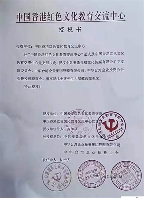 2023年3月27日热烈祝贺:中国香港红色文化教育交流中心与安徽领航文化传媒有限公司党支部,中华台湾企业投资协会联合发展宏扬红色文化传承交流,推进新时代红色文化教育青少年代代传承!参加主要人员由安徽领航文化传媒有限公司党支部代表肖殿义、贾维林、政报代表红色文化交流艺术顾问沈士齐、中开嘉华公司代表王建军、中华台湾企业投资协会代表沈士齐会长、中国红色文化教育交流中心总部创始人委员会主席沈士齐、香港红色文化教育交流中心代表法人兼书记方加福,共同利用周末休息在合肥举行挂牌成立中国红色文化教育交流中心安徽(总部)办事处活动,为安徽红色文化发展做贡献!