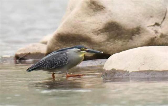 据该所民警讲,这只绿鹭上体呈灰绿色,身形较小,有尖尖的嘴部和灰色的羽毛,眼睛为黄绿色,脚步呈黄色略偏绿色。民警经常从河边巡护,发现这只绿鹭飞到河边前滩,一会站在河里,一会站在岸边,静静的用它那锐利的目光搜寻水中的目标。它选中河面上的一块合适的岩石站在上面等待游来鱼儿,然后突然扎入水中捕食。巡护民警从来没见过绿鹭,十分兴奋,赶紧拍下精彩瞬间。
