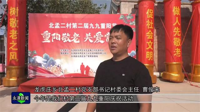 龙虎庄乡北孟二村党支部书记村委会主任 曹俊来 今年是我们村第二届九九重阳庆祝活动,我们会继续坚持下去,在全村弘扬尊老敬老的风气,让尊老敬老成为时尚,做到人人尊老、人人敬老,打造文明、幸福、和谐的村街。