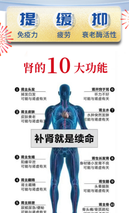 核心功效改善肾脏衰老,激发肾脏潜能,扶元气、提免疫、抗衰老、好面色、不疲劳、少起夜。
