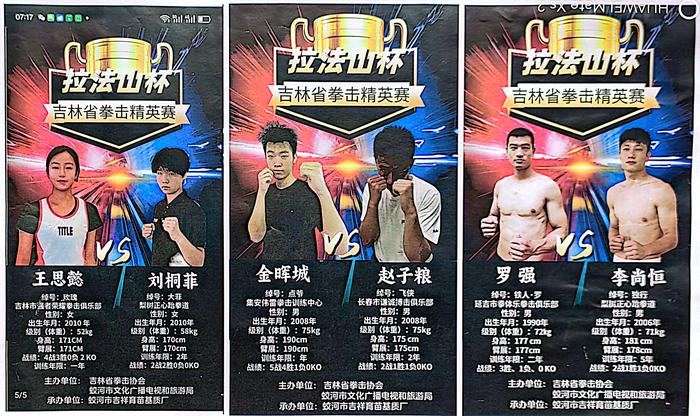 延吉拳体乐拳击格斗俱乐部禹尚勋对决梨树正心跆拳道馆王淇、延吉拳体乐拳击格斗俱乐部渠智程对决武动人生俱乐部张雨、集安伟雷拳击训练中心封雨辰对决鹰图腾明玉拳击俱乐部陈祉诚、梨树正心跆拳道馆国印对决鹰图腾明玉拳击俱乐部王阔、延吉拳体乐拳击俱乐部柏奥强对决震星拳击俱乐部王传皓、强者荣耀拳击俱乐部王思懿(女)对决梨树正心跆拳道馆刘桐菲(女)、延吉拳体乐拳击格斗俱乐部罗强对决梨树正心跆拳道馆李尚恒、伟雷拳击训练中心金晖城对决武动人俱乐部生赵子粮、延吉拳体乐拳击格斗俱乐部赵健对决武动人生俱乐部赵鑫瑞、延吉拳体乐拳击格斗俱乐部闫峻豪对决武动人生俱乐部张博威、延吉拳体乐拳击格斗俱乐部李翔宇对决延吉拳体乐拳击格斗俱乐部魏家平。